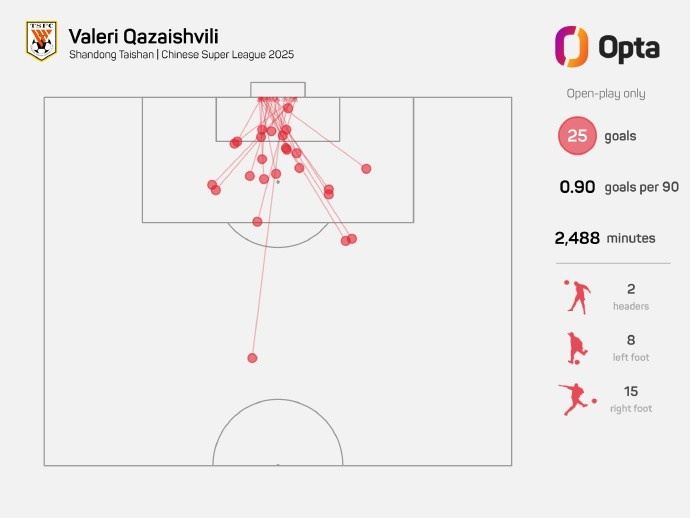 卡扎伊什维利本赛季运动战进25球,刷新单赛季中超运动战进球纪录